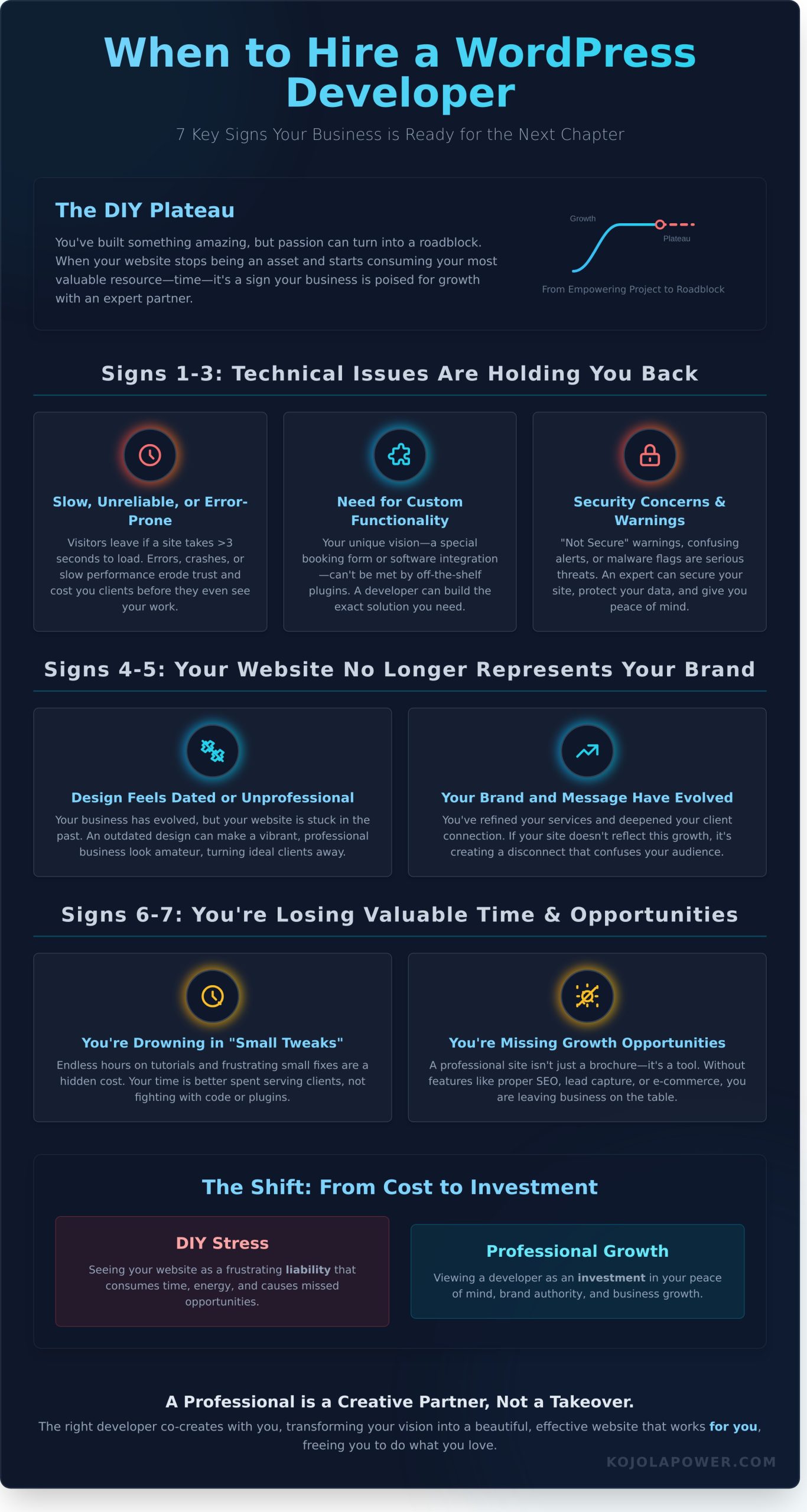 - Learn to identify key technical issues, from slow speeds to security warnings, that signal it’s time to hire a WordPress developer, like the specialists at KojolaPower.